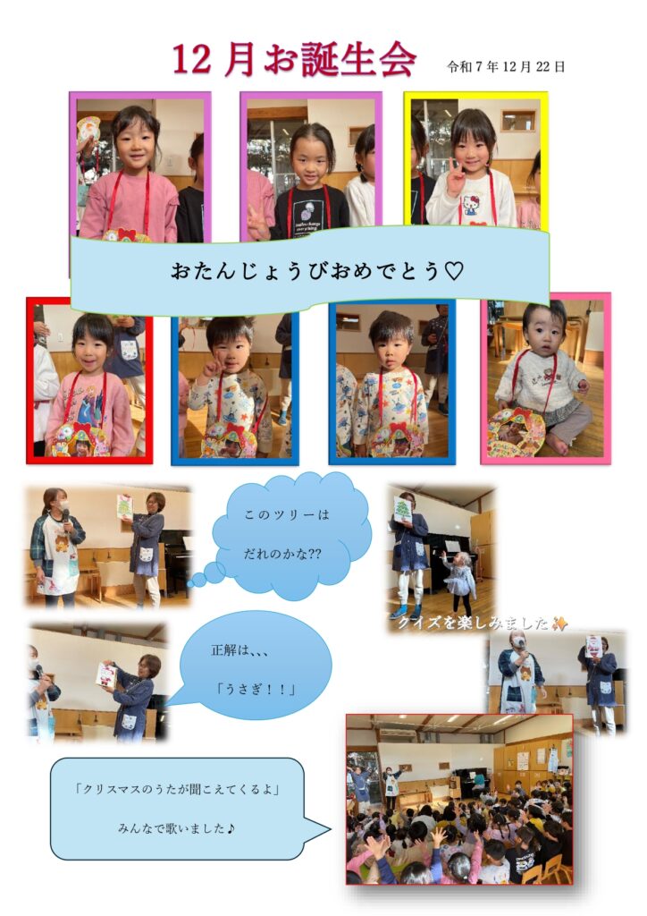 12月誕生会 2025年12月23日 最終更新日時 : 2025年12月23日 mizuochi 12月の誕生会をおこないました。 『だれのツリーかなクイズ』をやったり、『クリスマスのうたが聞こえてくるよ』をみんなで歌ったりしました♪
