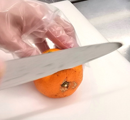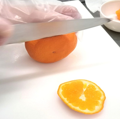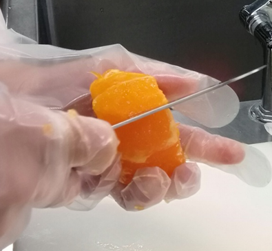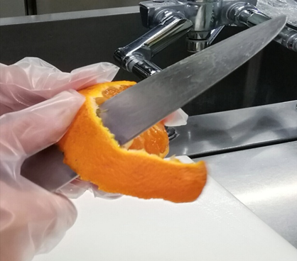 ④果肉に沿ってV字型に包丁を入れ、一房ずつ果肉を取り出す