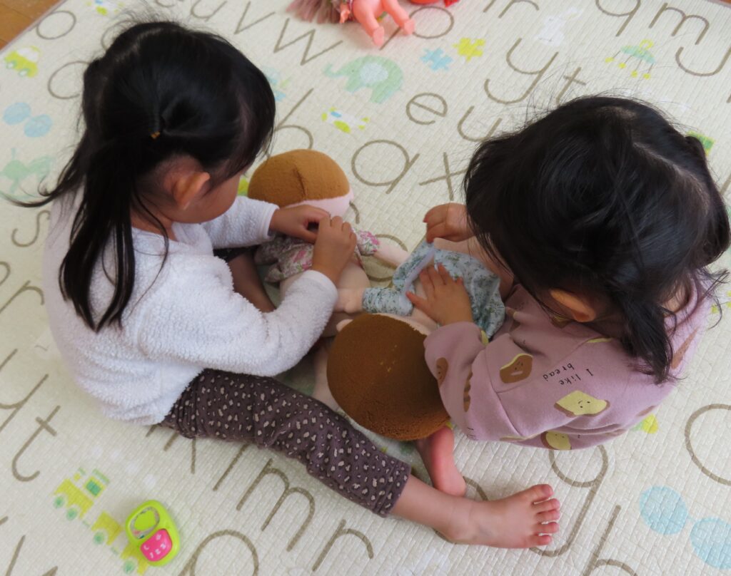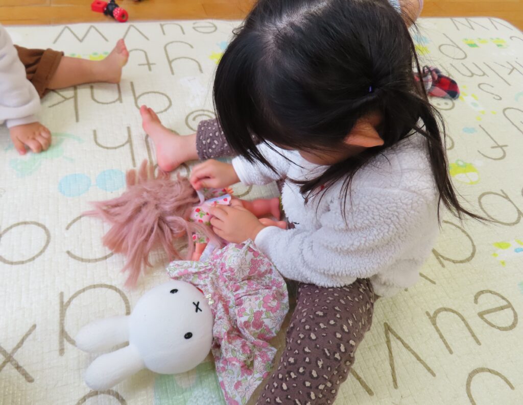 「入らないと思うよ…」と声を掛けますが、「小さくなぁい!これ着る!」と訴え、この子には絶対にこれ!と、執念すら感じる眼差しでコーディネート。小さな服に、お人形の腕をギュウギュウ押し込みます(笑)